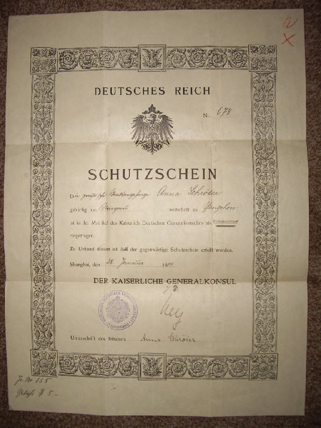 Von der im Schein genannten Person besitze ich noch eine Geburtsurkunde, Fotos (unterschiedliches Alter), einen Brief von 1941 (Angriff der Japaner - Zerstörung des Missionshauses), ein Tagebuch (von 1933-1949), etc.