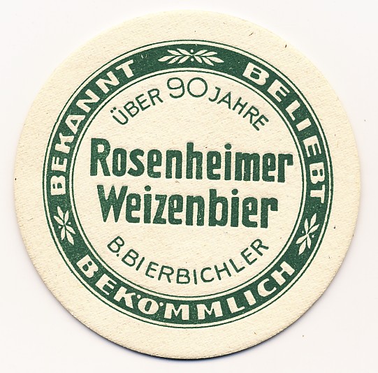 Ein nettes Beispiel zum Thema "Namen und Berufe" ist sicherlich die Weizenbierbrauerei von Benedikt Bierbichler in Rosenheim. Der gelernte Fischer übernahm 1907 die zwei Jahre zuvor gegründete Wirtschaft an der Gillitzer Straße / Ecke Herzog-Heinrich-Straße und bezeichnete sie als "Fischküche Bierbichler". Gleichzeitig begann er, Weißbier zu brauen und schenkte es in seiner Gaststätte aus. Es war nur dort zu haben. Diese Tradition hielt sich genau 90 Jahre lang bis 1997, dann wurde der Braubetrieb eingestellt. Die Fischküche gibt es immer noch, das Bier kommt jetzt allerdings von woanders. Leider wird immer noch so getan, als ob der Hopfensaft in Eigenregie hergestellt wird. Eine bekannte Unart heutzutage. Ich habe die Wirtschaft zwischen 1991 und 2008 mehrfach besucht, finde in meinem Bierdeckel-Fundus aber auf die Schnelle nur einen einzigen Bierdeckel neueren Datums, der kurz nach der Einstellung des Braubetriebes entstanden sein muß.