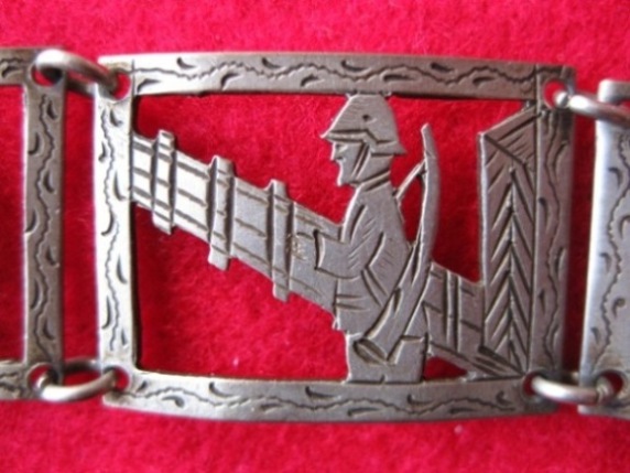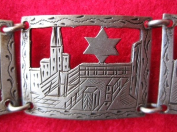Meine Vermutung: es könnte aus einem Lager stammen: dafür spricht das Datum auf der Rückseite, die Schrift scheint polnisch zu sein. Das vierte Glied erinnert an das Warschauer Ghetto, das aber zum Zeitpukt des Datums schon zerstört war. Die Familie, die mir dieses Armband (15 cm lang,2 cm breit,nichtmagnetisch) gab, sagte, sie wüßten nicht wo es herstammt, sei aber schon lange Zeit in ihrem Besitz. Die drei ersten Glieder folgen im nächsten Beitrag - paßten hier nicht mehr hin.