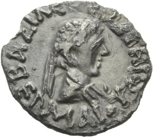 Menander – interessanterweise im Avers typengleich mit der oben gezeigten Ausgabe des Demetrios. Man darf hier die Signalisierung einer Kontinuität zu den Vorläufern vermuten. Das Elefanten-Motiv deutet die Eroberungen in Indien an.