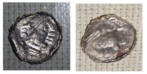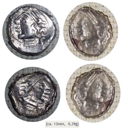 Nr.3 finde ich am spannendsten, denn es ist nur eine "halbe Münze". Sie schien mal subaerat, oder besser subferrat, gewesen zu sein, doch es blieb nur die Silberfolie einer Seite (vorn) übrig. Es ist leider nur ein Kopf n.l. ohne Schriftzeichen zu erkennen. Erinnert mich entfernt an die Roma-Büsten der republikan. Denare. Doch was ist es? (ca. 13mm, 0,39g)
