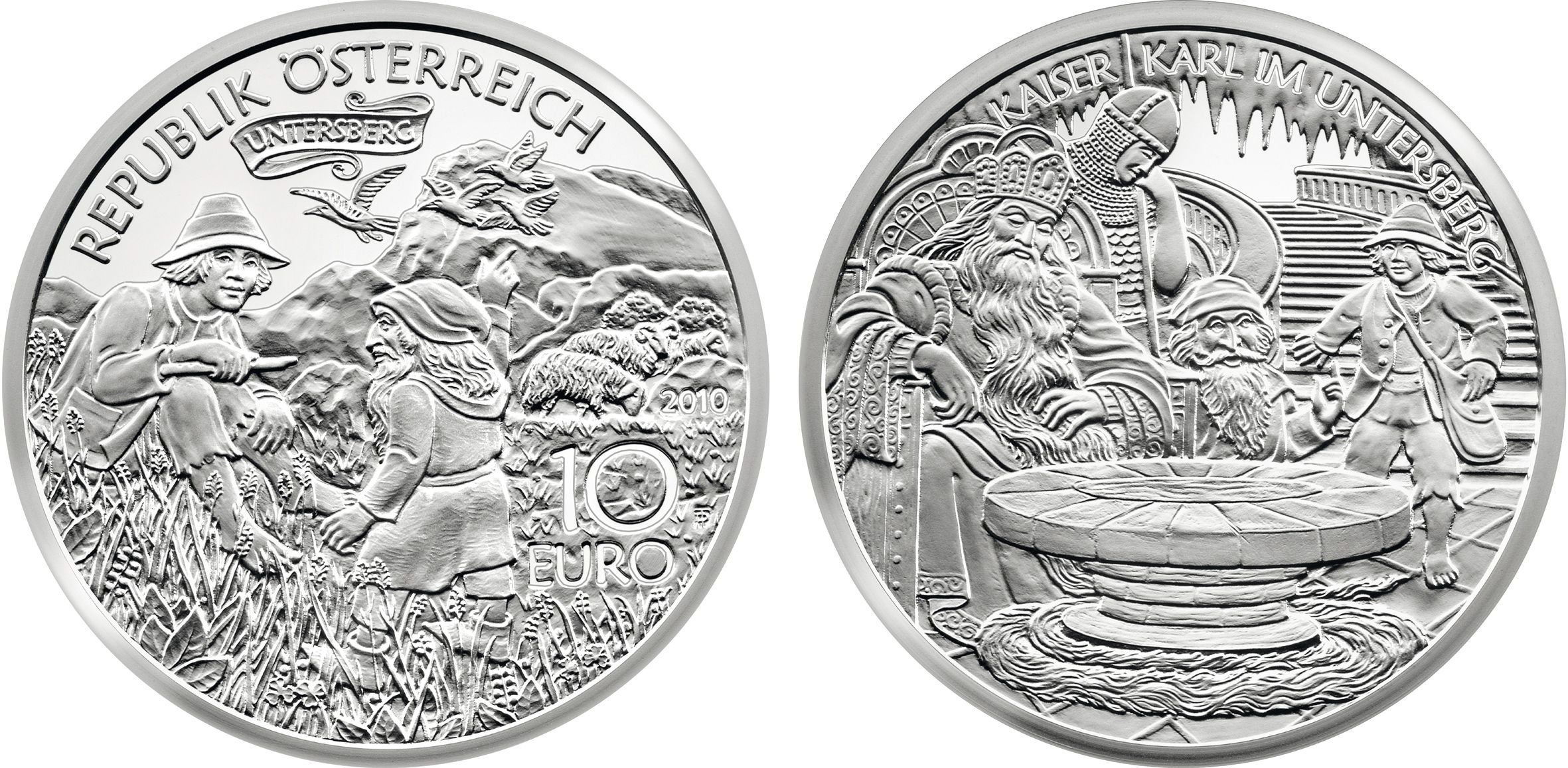 Die Serie „Sagen und Legenden in Österreich“ aus sechs 10-Euro-Silberstücken nahm im April des Vorjahres mit der Wiener Sage „Der Basilisk“ und der Geschichte von „Richard Löwenherz in Dürnstein“ ihren Anfang. Heuer erschien schon die Münze „Der Erzberg in der Steiermark“, der nun „Karl der Große im Untersberg“ folgt. 2011 ergänzen dann „Der Lindwurm in Klagenfurt“ sowie „Der liebe Augustin“ – wohl eine der berühmtesten Sagen Österreichs – die Reihe.