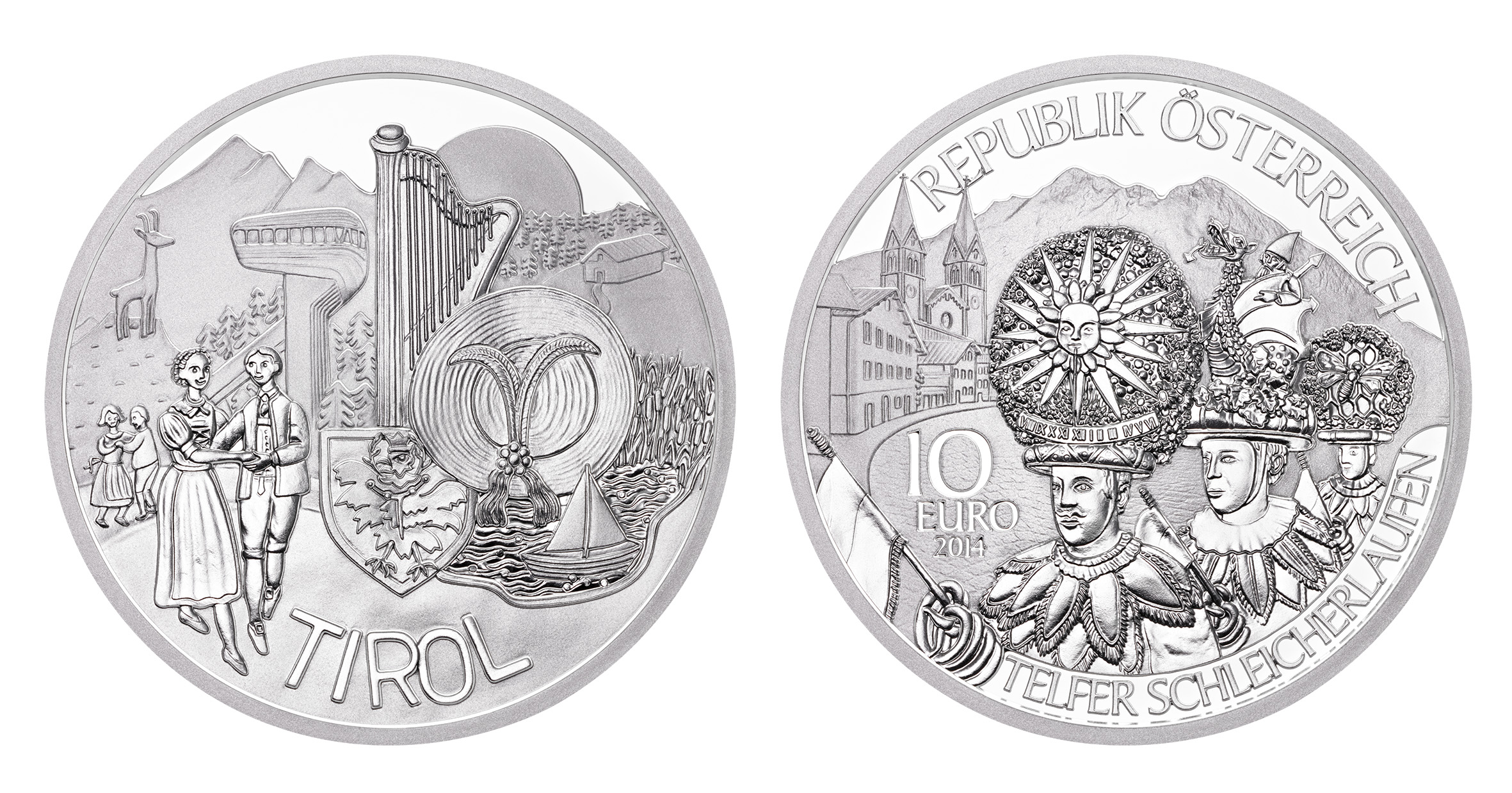 Das Münzbild auf der anderen Seite, basierend auf dem Siegerentwurf des Schulwettbewerbs, zeigt eine Vielzahl typisch Tiroler Motive. Den Hintergrund bildet eine Berglandschaft im Sonnenaufgang mit Hochwald, Alm und Almhütte. Davor gesetzt sind links eine Gämse auf einem Felsen und rechts davon die Bergisel-Schisprungschanze. Im Hintergrund ist ein Nadelwald zu erkennen. Mittig ist eine Tiroler Harfe platziert, darunter das Tiroler Wappen. Beide sind zum Teil von einem Tiroler Trachtenhut mit Feder- und Blumenschmuck überdeckt. Ein kleiner Teich mit Segelboot schaut unter dem Hut und dem Wappen hervor. Links im Vordergrund sind ein Tanzpaar in Tiroler Tracht und, links dahinter, tanzende Kinder dargestellt.