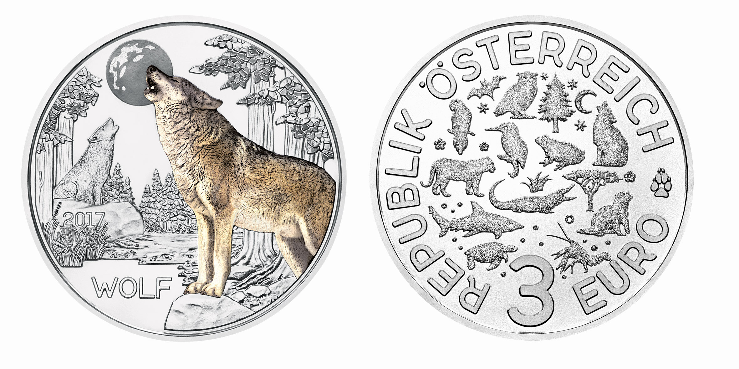 Die Wertseite des färbigen 3-Euro-Tier-Talers „Wolf“ (Buntmetall, Auflage 50.000 Stück) zeigt im Stil eines Scherenschnittes die Tiere der zwölfteiligen Serie. Auf der anderen Münzseite wird der Mond von zwei Wölfen angeheult; derjenige im Vordergrund trägt ein braunes Fell, das im Dunkeln schimmert. Für den Endkunden sind die Münzen unverpackt.