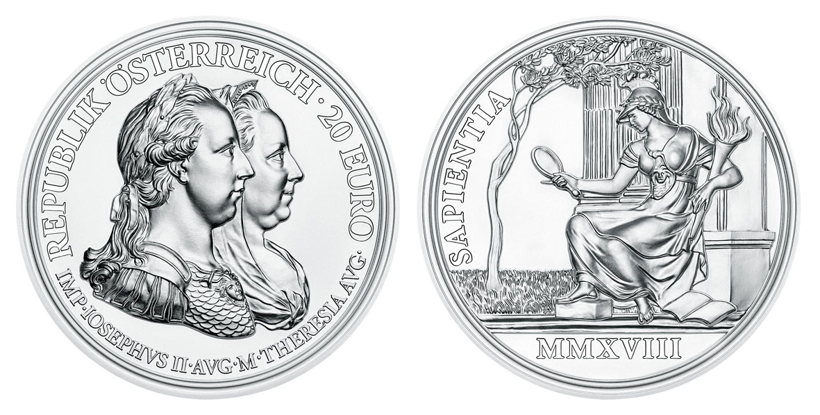 Die Wertseite zeigt ein Brustbild Maria Theresias mit ihrem Sohn Joseph II im Vordergrund. In der Umschrift ist der Text „IMP IOSEPHVS II AVG M THERESIA AVG“ („Imperator Josephus II Augustus, Maria Theresia Augusta“) zu lesen. Das Münzbild basiert auf einer historischen Vorlage, die mit F. Würth F. signiert ist. Auf der anderen Seite sind mehrere Elemente historischer Medaillen zu einem Motiv vereint. Die allegorische Darstellung der Weisheit in Form einer Frauenfigur befindet sich in der rechten Münzhälfte. Am linken Münzrand ist die Umschrift „Sapientia“ (Weisheit) zu lesen.