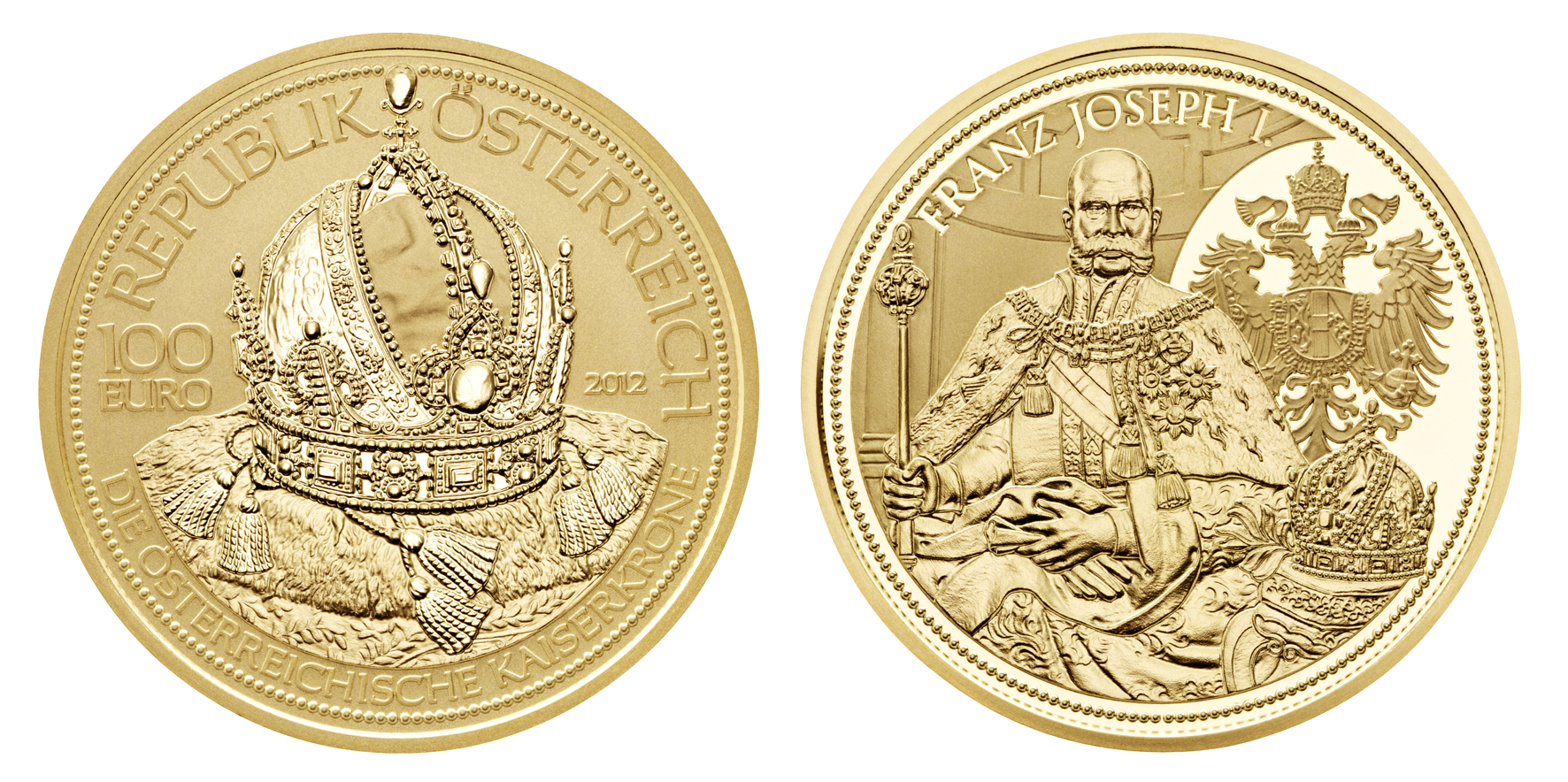 Franz Joseph I.Die andere Seite der Münze bildet Kaiser Franz Joseph I. (1830 – 1916) im österreichischen Krönungsornat ab. Rechts neben ihm ist die Österreichische Kaiserkrone platziert. Da mit Franz Joseph I. die Dynastie der Habsburger zu Ende ging, passt sein Porträt optimal als Motiv für das letzte Serienstück. Das Ölgemälde, das dem Münzbild als Vorlage dient, befindet sich im Obersten Gerichtshof in Wien.