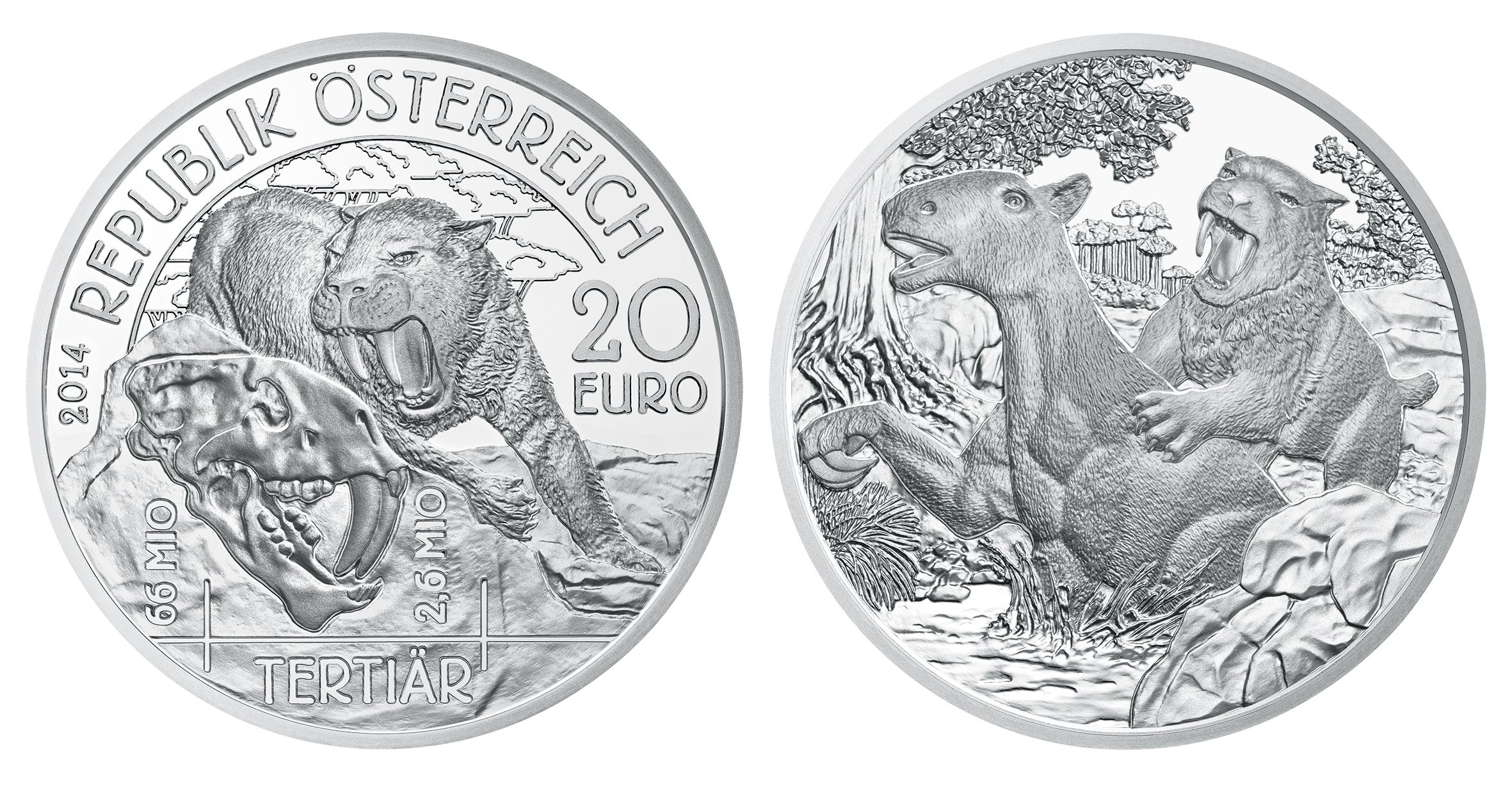 Auf der Wertseite der vierten Münze der Serie "Lebendige Urzeit" ist ein Schädelfund zu sehen, aus welchem die Forscher eine Säbelzahnkatze rekonstruiert haben; eine solche fletscht im Mittelgrund ihre Zähne. Stilisiert dargestellte Bäume im Bildhintergrund stehen für den Lebensraum Land. Eine Zeitleiste in der unteren Münzhälfte gibt den Beginn des Tertiärs mit "66 Mio." und das Ende mit "2,6 Mio." Jahren vor unserer Zeit an.