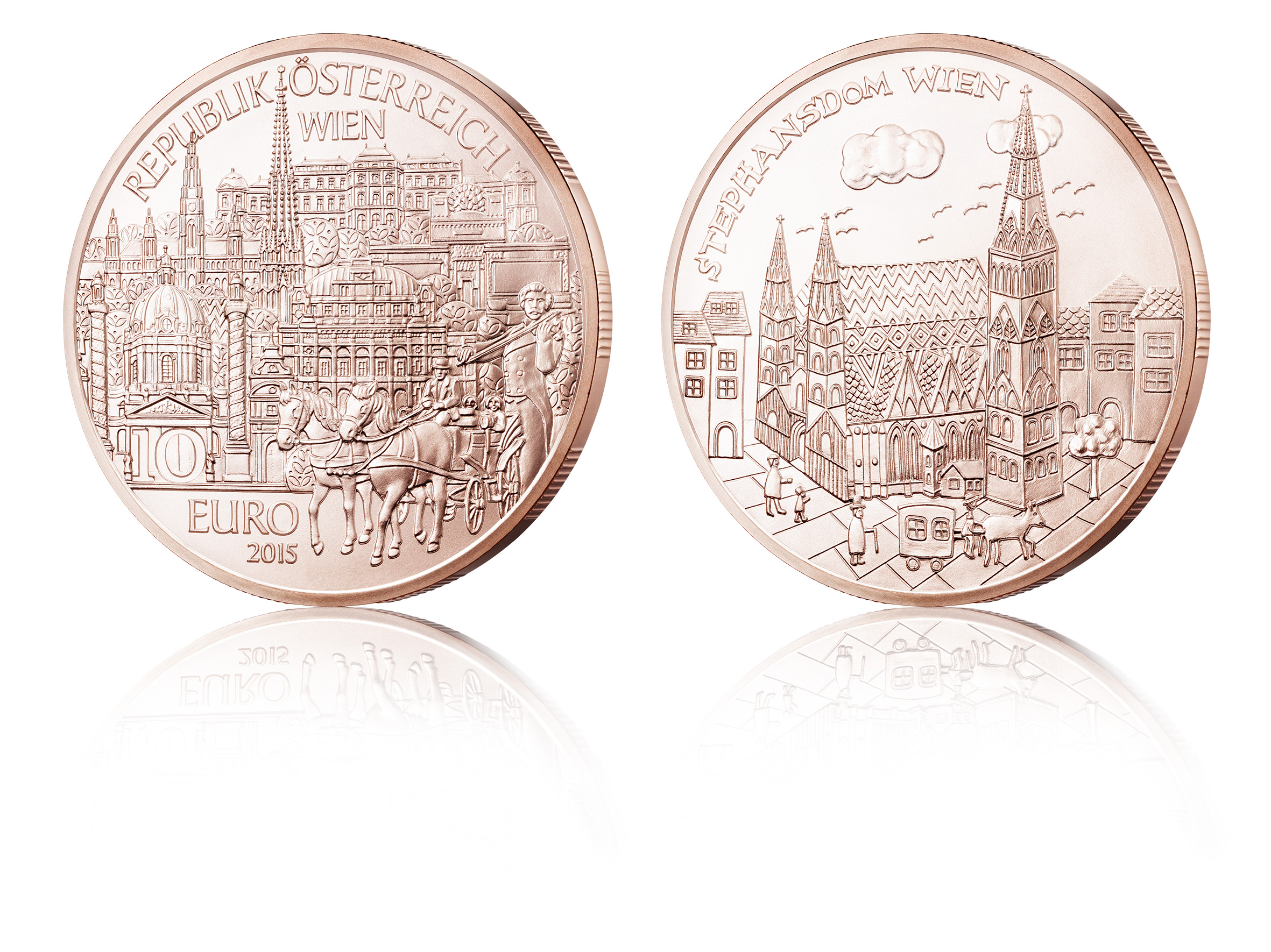 Auf der anderen Seite ist der adaptierte Siegerentwurf des Schülerwettbewerbes zu sehen. Der Wiener Stephansdom bildet das Hauptmotiv. Links und rechts vom Dom ist eine Häusergruppe zu sehen. Stilisiert dargestellte Vögel und Wolken füllen die freie Fläche im oberen Teil der Münze. Figuren, ein Fiakergespann und ein Baum zieren den unteren Rand. Der Text „STEPHANSDOM WIEN“ ist bogenförmig in die obere Münzhälfte gesetzt.