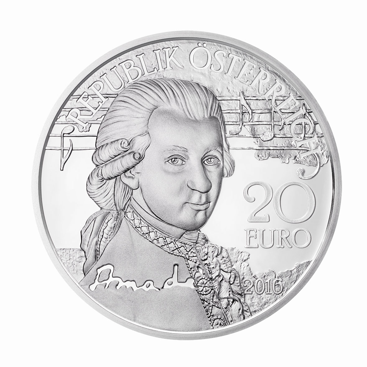 Dahinter setzt sich das Band mit Noten und der strukturierte Hintergrund der ersten Münze der dreiteiligen Reihe fort. Auf Mozarts Rock ist ein Teil seiner Unterschrift, „Amadé“, zu lesen.