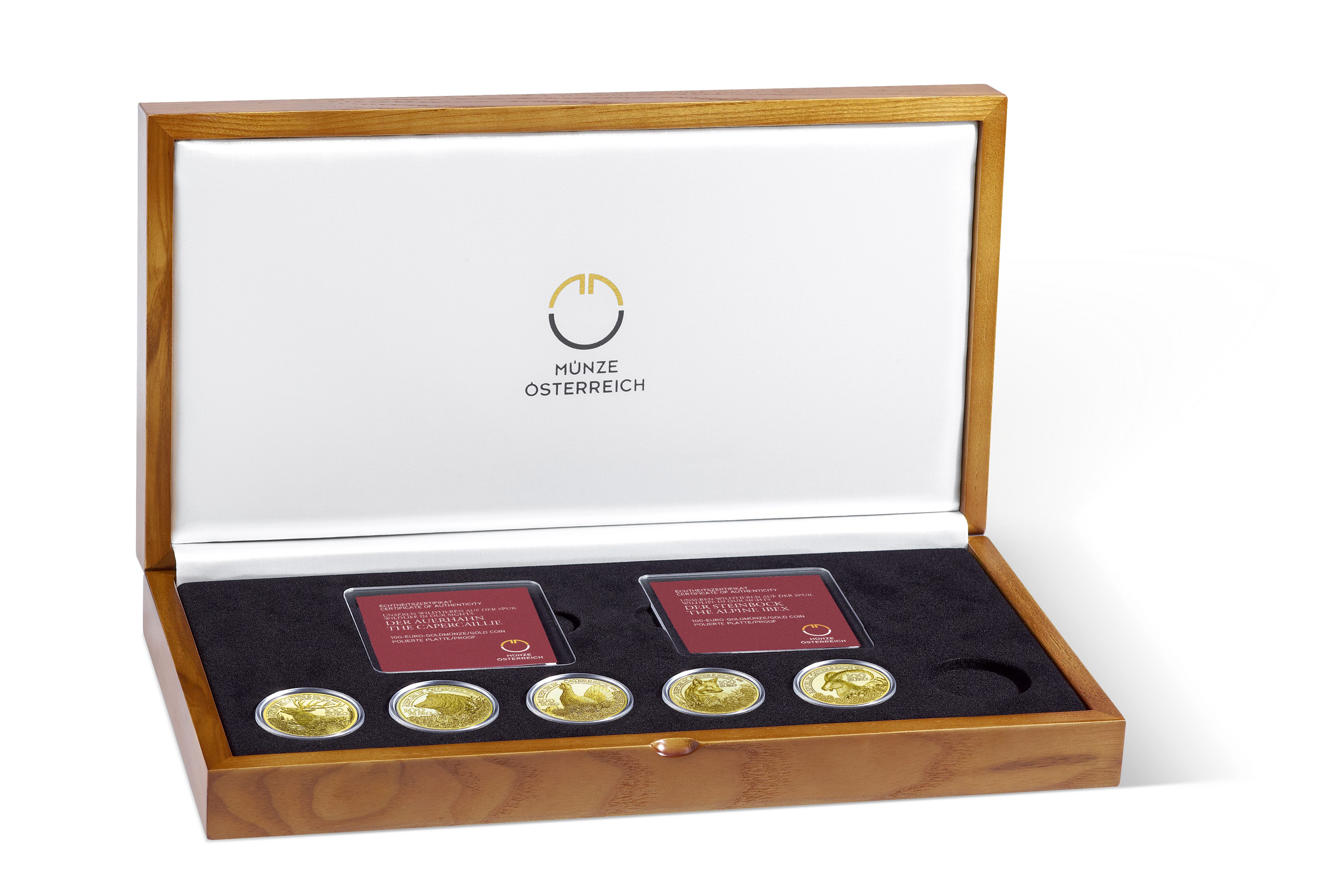 Ausgabetag 18. Oktober 2017 Qualität Polierte Platte / Proof Serie Unseren Wildtieren auf der Spur Nennwert 100 Euro Graveure Mag. Helmut Andexlinger, Herbert Wähner, Kathrin Kuntner Durchmesser 30,00 mm Legierung Gold Au 986 Feingewicht 16,00 g / 0,50 oz Gesamtgewicht 16,32 g Lieferumfang Im Etui mit nummeriertem Zertifikat und Schuber