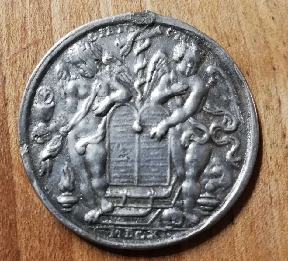 Diese Medaille besitze ich schon einige Zeit. Bin bis jetzt leider noch nicht draufgekommen wer der Medailleur ist und zu welchen Zweck/Anlass solche Medaillen gemacht wurden. Es gibt eine Henkelspur aber durch diesen Bruch sieht man leider einen Teil einer Aufschrift nicht mehr. Es dürfte sich um Salvator Mundi handeln und darüber der Psalm 132 niedergeschrieben. Auf der Rückseite 2 Engel mit der Steintafel und den 10 Geboten? Maße: 33mm, Gewicht: 10,33gr. Material Silber.