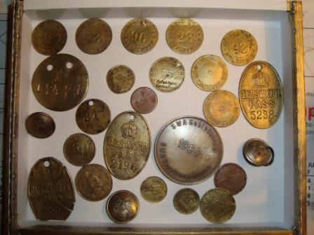 Deine (beiden) Marken mit Löchern sehen nicht so aus, als ob die Löcher mit einem Nagel gemacht worden wären. Das eine zumindest ist sauber gebohrt. Entwertungslöcher werden normalerweise auch nicht randlich eingeschlagen, sondern mittig (obwohl es in Österreich ein Gegenbeispiel bei einer Telefonmünze gibt, hier wurde aber ein Stück des Randes ausgebrochen um die Marke zu entwerten). Wenn es nicht ein Schlüsselanhänger für den Zimmerschlüssel war (und die ungelochte die Korntrollmarke), dann würde ich eher eine Zweitverwendung als Kettenanhänger vermuten.