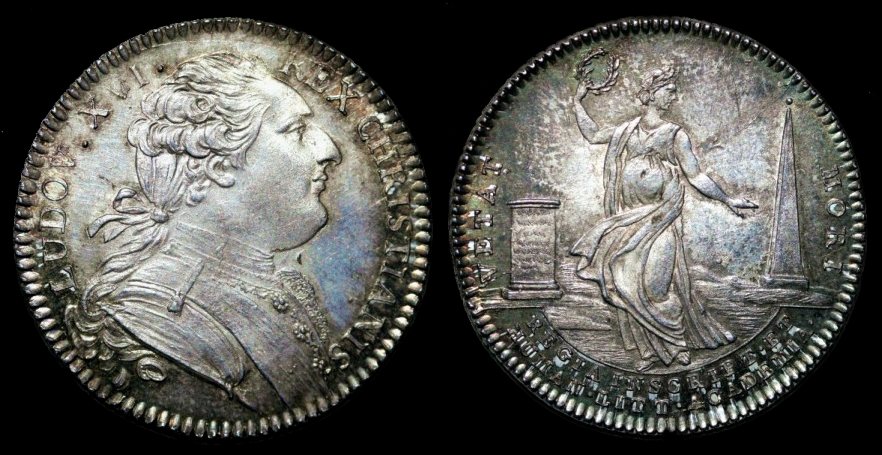 Rv. Bekrönte Stadtgöttin von Paris sitzt rechts, nach rechts weisend, gestützt auf Schild mit Stadtwappen, im Hintergrund die Tuilerien und Notre Dame. VILLE DE PARIS, Signatur J. DU VIV. Exergue Girlande und Lilie. Silber, 31,0 mm, 10,20 g. Feuardent 3732, Corre 1065,