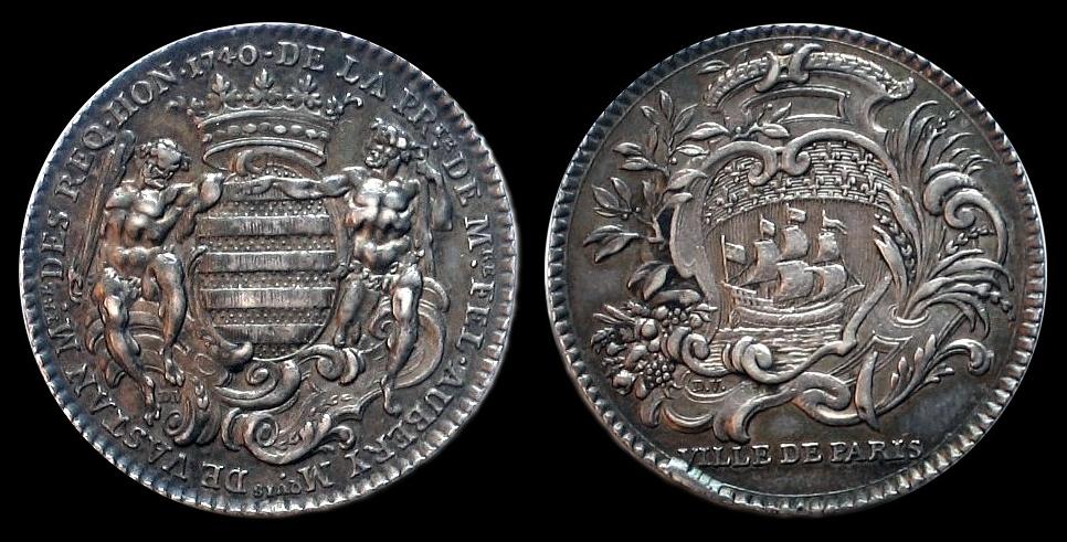 Jeton 1740, Paris - Prévôts des Marchands, Félix Aubery 1740–1743. Av. Bekröntes Wappen (auf Gold fünf rote Balken) des Félix Aubery, Schildhalter zwei Wilde Männer, DE. LA. PR(évô)TE. DE. M(essi)RE. FEL(ix). AUBERY. M(ar)QUIS. DE. VASTAN. M(ai)TRE. DES. REQ. HON. 1740., Signatur D. V.