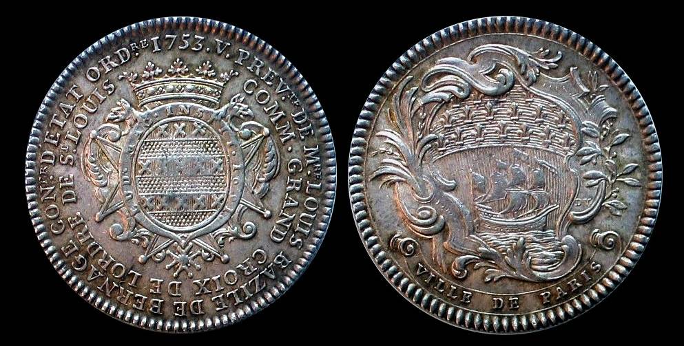 Jeton 1753, Paris - Prévôts des Marchands, Louis Bazile de Bernage 1743–1758, Av. Bekröntes Wappen des Louis Bazile de Bernage, aufgelegt auf den Orden des Grand-Croix de Saint-Louis mit Band, darauf die Legende LUD. MAG. INSTUT. 1691. Randschrift V PREV(ô)te. DE M(essi)re. LOUIS BAZILE DE BERNAGE CON(seill)er. D'ETAT ORDre.(1753).. ; im Innenkreis Fortsetzung der Randschrift : COMM. GRAND CROIX DE L'ORDRE DE St LOUIS.