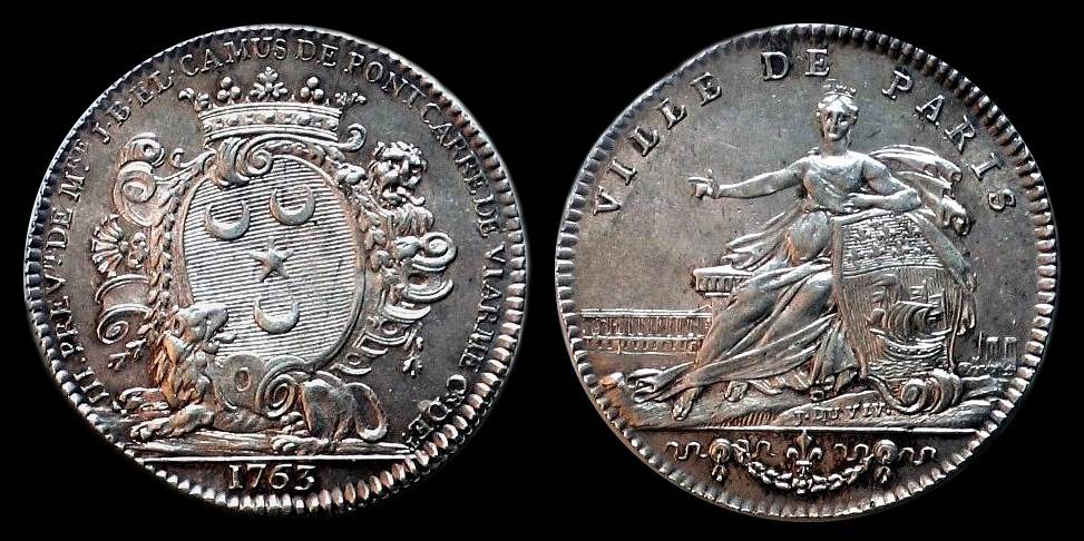 Jeton 1763, Paris - Prévôts des Marchands, Jean-Baptiste Éric Camus de Pontcarré 1758–1764. Av. Bekröntes Wappen (auf Blau in Silber drei Halbmonde um fünfstrahligen Stern) in Kartusche, Schildhalter ein Löwe, darunter ein weiterer Löwe ruhend, Umschrift III. PREV(ô)té. DE M(essi)re. J. B. EL. CAMUS DE PONTCARRE DE VIARME C(onseilleu)r D'Et(at) .