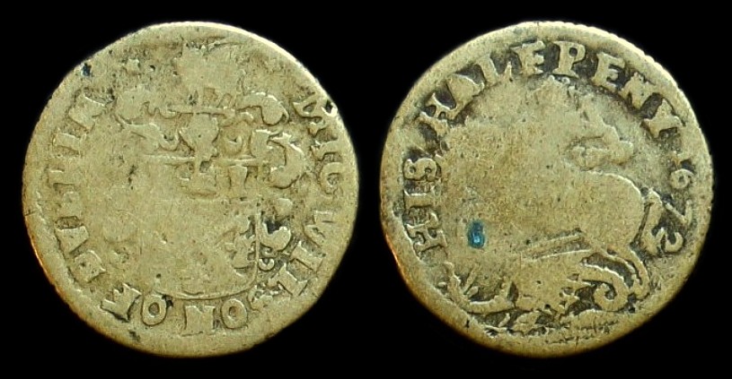 Dublin, Mic Wilson 1672 Halfpenny - "Butchers Halfpence". Av. Behelmtes Wappen der Fleischhauergilde (?) * MIC WILSON OF DVBLIN. Rv. St. Georg im Kampf mit dem Drachen HIS HALFPENY 1672. M. Dickinson 416.
