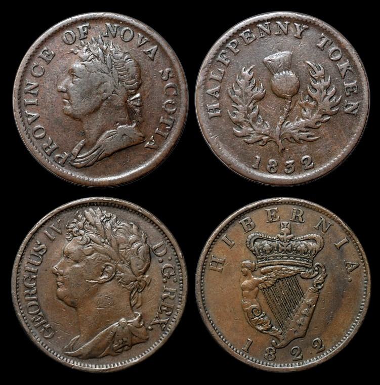 Bleiben wir nun noch ein wenig bei Nova Scotia. 1817 hatte die Legislative der Provinz die britische Krone ersucht, eigene Münzen verausgaben zu dürfen. Nach anfänglichen Erfolgen wurde die Genehmigung jedoch von der Krone letztendlich verweigert. 1824 orderte man daher ohne weitere Rücksprache Token von einer Firma in Birmingham. Diese Token wurden gut angenommen, und eine weitere Charge wurde 1832 geordert. Diese Token zeigen das Portrait von George IV, ohne ihn zu nennen, in der Umschrift PROVINCE OF NOVA SCOTIA. (