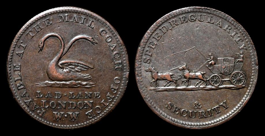 Die beiden folgenden Token geben Gelegenheit für einen Blick auf die Anfänge eines regulären Postkutschendienstes in England. Reitende Boten hatte es schon lange zuvor gegeben. Im August 1784 gelang es jedoch John Palmer, seines Zeichens Theaterdirektor von Bath und Bristol, das Parlament von seinem Projekt der Einrichtung eines solchen Dienstes zu überzeugen, indem er eine Postkutsche von London nach Bristol fahren ließ, die ihr Ziel nach nur gut 15 Stunden Fahrzeit erreichte. Das war weniger als die Hälfte der Zeit, die bis dahin für diese Strecke benötigt wurde.
