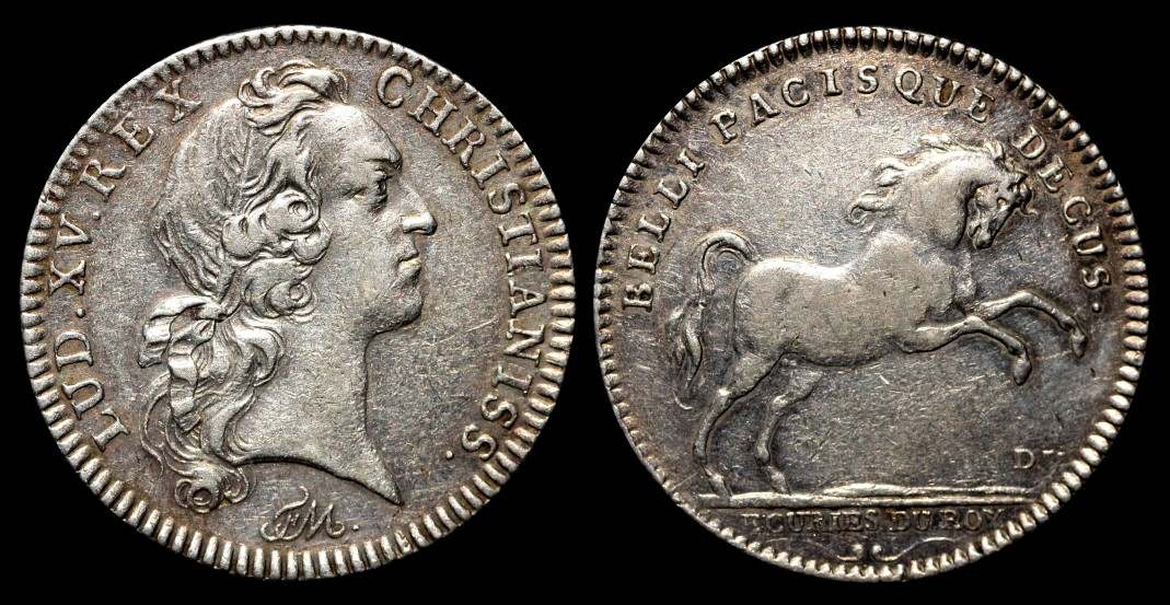 Das Pferd auf dem Jeton begleitete Louis XV. über weite Strecken seines Lebens. Es gibt sechs Versionen dieses Jetons, auf denen nur der König alterte. Das Pferd blieb davon verschont.