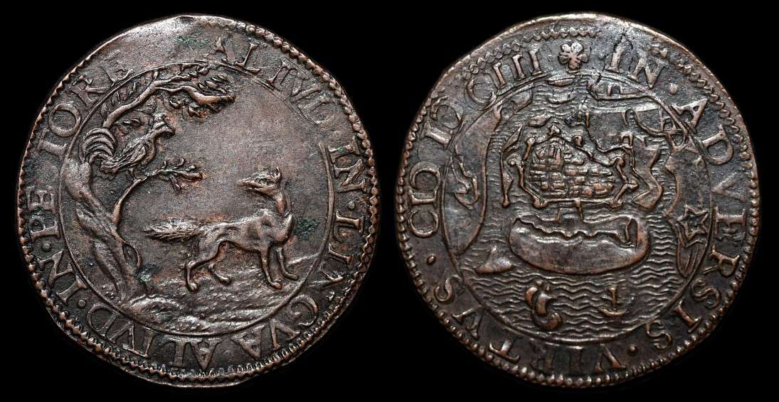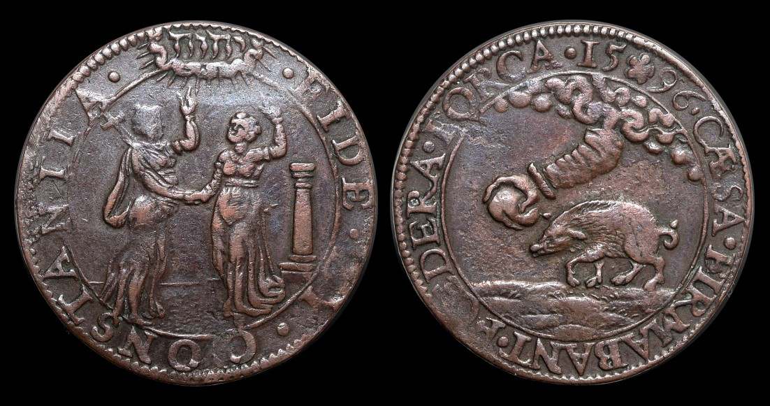 Nördliche Niederlande - Dordrecht, Rechenpfennig 1582. Attentat auf Wilhelm von Oranien, den Schweiger. Av. Der mißglückte Anschlag auf den Fürsten. Wilhelm von Oranien steht halbrechts, neben ihm richtet der Attentäter Jean Jaurégny eine Pistole auf seinen Kopf. PRODITIONE NON ARMIS AGITVR (Durch Verrat, nicht mit Waffen wird gehandelt). Rv. Blitze und Hagel gehen aus einer Wolke als Strafe Gottes auf Philipp II. nieder. Ein Gefolgsmann und ein Soldat stehen zur Linken des Königs. PRODITOR TANDEM LVET (Der Verräter wird dennoch vom Unheil getroffen). (Dugn.2890, v Loon I. 315, Tas184, SBV 31, 292a, ). Anm. Seltener zeitgenössischer numismatischer Beleg der bildlichen Darstellung einer Handfeuerwaffe des 16. Jahrhunderts