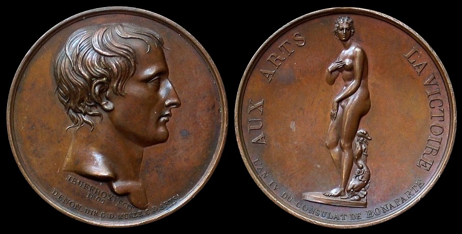 Vivant Denon überreichte Napoleon die für diesen Anlass geprägte Medaille am 16. August 1803 bei einem zeremoniellen Besuch des Louvre. Im Juli 1803 war das Musée Central des Arts auf Denons Vorschlag in Musée Napoléon umbenannt worden. Es ist die erste Medaille, die unter Denons Leitung entstand, wie an dem alten Titel Directeur General du Musée Central des Arts auf der Rückseite zu erkennen ist. Charakteristisch für Denon ist, dass nicht nur eine schöne nackte Frau auf seiner ersten Medaille abgebildet ist, sondern auch das Motto auftaucht: „Den Künsten den Sieg“. Für den großangelegten Kunstraub unter Napoleon galt dagegen das Motto umgekehrt: Den Siegern die Kunst.