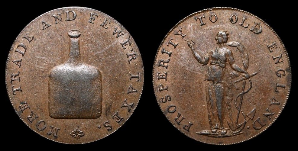 Richard Dinmore und sein Sohn sollen lt. BELL als Sattler, Eisenwaren- und Hanfwarenhändler tätig gewesen sein. Von daher drängt sich die Darstellung einer Flasche nicht gerade auf. Der Token dürfte von etwa 1795 sein. Zum damaligen Zeitpunkt führte England Krieg mit Frankreich, der Handel mit dem Kontinent lag darnieder und William Pitt sanierte den Haushalt mit neuen Steuern, darunter sogar eine auf Haarpuder. Gerade Norwich litt sehr unter der Situation, die Leute hungerten. Norwich war konsequenterweise mehrheitlich im Lager der Regierungsgegner, die Norwich Patriotic Society, die der London Corresponding Society nahestand, war gegen den Krieg mit Frankreich, gegen die neuen Steuern und wolte den Handel befördern, um für die kleinen Leute wieder den Wohlstand, der bis in die 1780er Jahre üblich war, zu schaffen. Die Konservativen und die Anhänger Pitts denunzierten die Reformer als Jakobiner. Dagegen erschien eine Verteidigungsschrift eines Richard Dinmore jun. aus Norwich. (Ich habe noch keinen endgültigen Beweis, daß dieser Dinmore der "Son" von dem Token ist.) In dieser Schrift findet sich aber die Bezeichnung Napoleons als "bottle conjurer". Dieser Begriff "Flaschenverschwörer" geht zurück auf einen Theaterskandal in London aus dem Jahr 1748. Dort wurde in einem Theater die Vorführung eines Magiers angepriesen, der sich in eine Quart-Flasche (1,13 Liter) hineinzaubern könnte. Das Theater war überfüllt, der Zauberer trat nicht auf und die empörte Menge zerlegte das Theater. Dieses Ereignis war noch hundert Jahre später im kollektiven Gedächtnis, so daß der Begriff in der politischen Rhetorik benutzt werden konnte. Die Bezeichnung wurde, wie zeitgenössische satirische Darstellungen belegen, auf Napoleon angewandt, den man für einen politischen Windbeutel hielt, der es nicht wert sei, ihn zu bekriegen, da sich das Problem von selbst erledigen würde. (Gerade die Reformer, die die Revolution begrüßt hatten, waren meist von der weiteren Entwicklung "not amused".) Ich habe also die Theorie, daß die Flasche hier als Symbol für Napoleon steht und der Token damit eine politische Werbemarke ist. Dafür spricht auch, daß er keine Währungsbezeichnung trägt und kein Zahlungsversprechen. Aber hier muß noch geforscht werden. Aufschlußreich wäre ein Durchgehen der Zeitungen aus Norwich 1794 ff. - Grüße, KarlAntonMartini