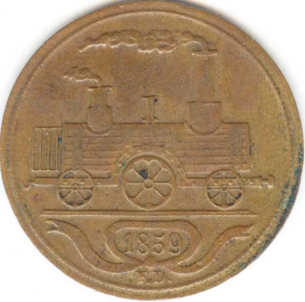 Meine Abbildung mit Eisenbahn von 1859 und Rückseite Monogramm "?" ist nirgends beschrieben, gehört aber optisch dazu, auch wegen der Seite mit der Lokomotive.