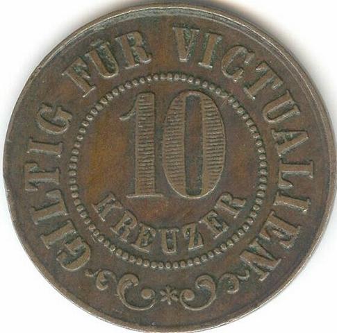 Die Rückseite mit "Gültig für 10 Kreuzer für Vigtualien" ist zum Einkauf von Lebensmittel bestimmt. Es gibt auch noch 3, 5 und 50 Kreuzer von dieser Firma.