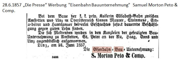 Zur Abbildung: Peto & Comp. Sir Samuel Morton Peto (4. August 1809 - 13. November 1889) war ein englischer Unternehmer, Ingenieur und Eisenbahnentwickler. Ich habe in den Zeitungen zwischen 1857 und 1867 interessante Beiträge zu diesem Eisenbahn-Bauunternehmen gefunden. 1867 Konkurs.