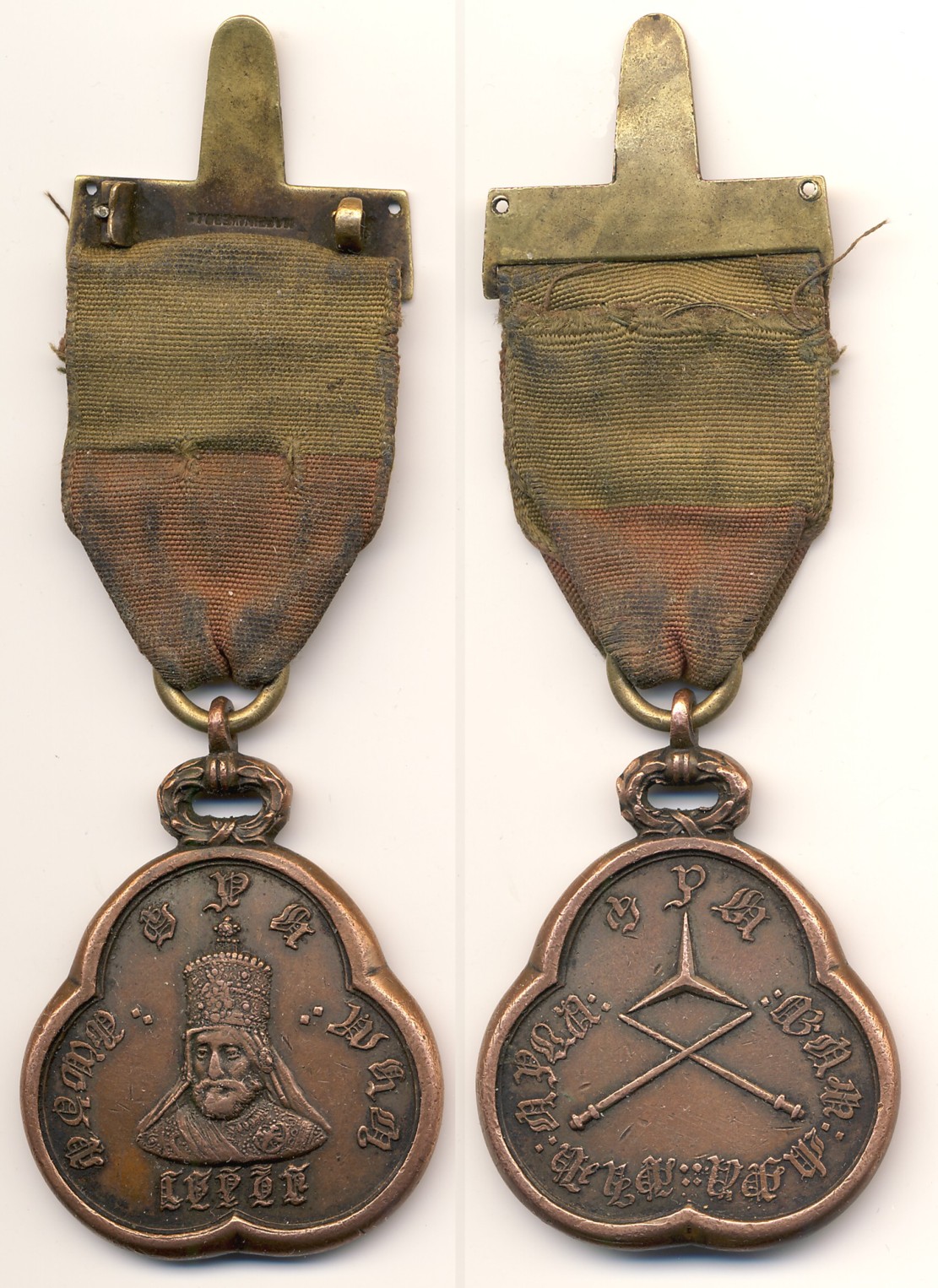 habe ich letztes Jahr in einem kleinen Shop in Addis Abeba aufgetrieben. Es ist aus Bronze, und wiegt mit Band und sonstigem Anhang 46,00 Gramm. Der abgerundete Rand ist glatt. Die Schieblehre weist über die Enden des gefühlten dreiblättrigen Kleeblattes einen Wert von 39,0 mm aus, wie er auch im Gill beschrieben ist. Sonstige Maße und Gewichte sind mit dem Gill nicht vergleichbar, da das ihm vorliegende Exemplar kein Band aufweist.