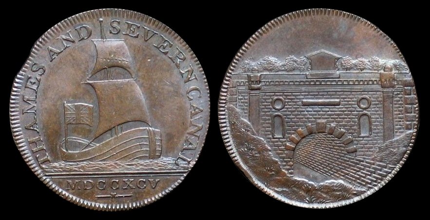 Der Token zeigt im Avers eine sogenannte "Savern trow" (einen besegelten Kahn) und im Revers die Einfahrt in den Tunnel des Thames and Severn Kanals, der – wie der Name schon sagt – eine Verbindung der Flüsse Severn und Themse schuf. Dieser Tunnel wurde auf einer Länge von ca. 4 Kilometer in den Felsen gesprengt. Die Höhe des Tunnels täuscht auf dem Token – das Boot vom Avers wäre nicht durchgekommen – er war mal grade ca. 5 Meter hoch und etwa ebenso breit. Die Bootsbesatzungen legten sich daher vor der Einfahrt auf Brettern quer über das Boot und schoben es mit der Kraft ihrer Beine durch den Tunnel.