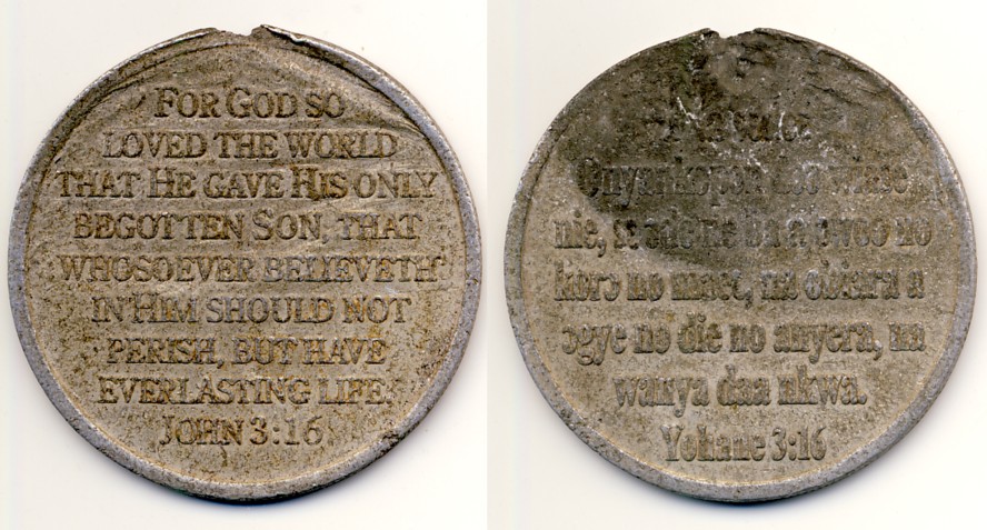 Das auf der Medaille in Englisch und Twi vorgestellte Zitat stammt aus dem ersten Brief des Apostels Johannes, dem auch das vierte von Rom authorisierte Evangelium zugeschrieben wird. Einigermaßen wörtlich übersetzt, liest man auf der englischen Seite: