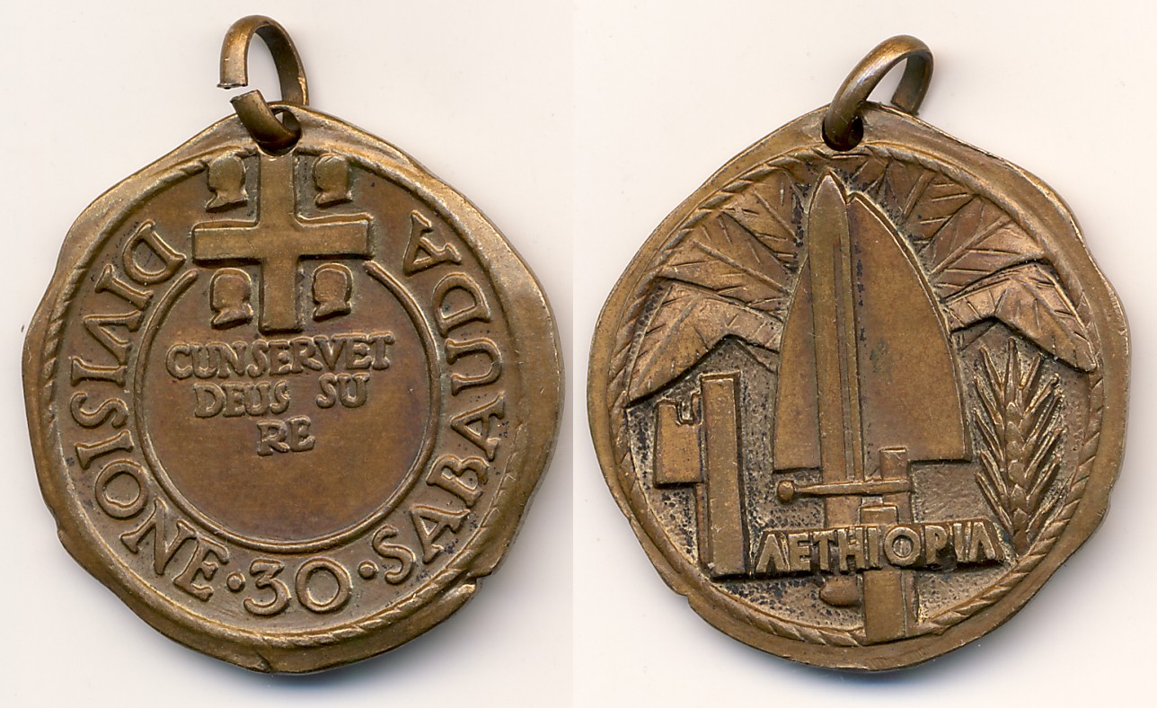 Die 30. italienische Infanterie-Division "Sabauda" war auf Sardinien stationiert. Was die Verbindung des Hauses Savoyen (Sabauda) mit Sardinen zu tun hat, googlen die interessierten Leser bitte selbst. Eine wesentliche Rolle dabei spielt das Jahr 1720. Die in Rede stehende Division war am sogenannten 2. Italo-Abessinian War 1936 in Ostafrika im Einsatz, wurde 1940 erneut mobilisiert und militärisch in Äthiopien aktiv. Einen Orden bzw. eine Ehrenmedaille dazu möchte ich Euch hier vorstellen. Zu welchem der beiden o.g. Einsätze dieser Division das Stück geprägt wurde, entzieht sich meiner Kenntnis.