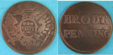 Brotpfennig o.J.. Kupfer, 21,2 mm, 2,79 g, Noss 631: Av. Gekrönter zweiköpfiger Adler, in der rechten Klaue ein Schwert, in der linken ein Zepter, auf der Brust eiförmiger Schild aus schlichter Doppellinie mit dem Stadtwappen. Die Krone hat an Stelle des Reifs einen Hermelinaufschlag, wie an den Kurhüten. Die Parierstange des Schwertes endigt beiderseits in Dreiblättern, am Zepter befinden sich oberhalb der Adlerklaue drei Kugeln, dann wächst aus vier abstehenden Blättchen, von welchen das hintere nicht sichtbar, der ge-drechselte sich verjüngende Stab, über dessen Spitze drei Kugeln in Dreipaßform und eine ganz kleine als Abschluß. Die Kronen im Schilde bestehen aus einem dreimal gezackten schmalen Reif mit einem Kreis darunter; die Münzen zwischen 1735 und 1742 haben ebenfalls Kronen mit sichtbarem unteren Rand, der aber dort als Oval gezeichnet ist. Außen Kerbkreis