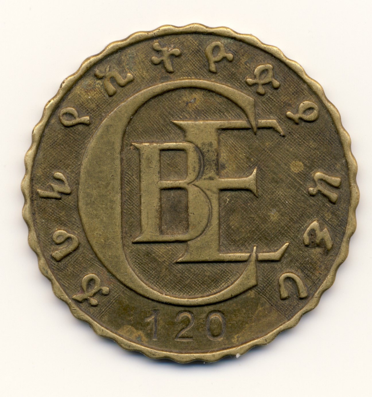 Was Ihr hier seht, ist eine Wartemarke der Commercial Bank of Ethiopia. Wir alle kennen die Zettel mit den Nümmerchen, die z.B. bei Finanzämtern oder KFZ-Zulassungsstellen gezogen werden müssen, um die Reihenfolge der Bearbeitung festzulegen. Früher machte man das ordentlich mit geprägten Marken. Auf dem afrikanischen Kontinent gab es zumindest bei Banken solche "queueing tokens" in vielen Ländern. Mir sind solche Beispiele u.a. aus Angola, Mosambik, Guinea-Bissau und dem Kongo bekannt. Auch bei meinem Besuch in Äthiopien vor ein paar Wochen bin ich über ein solches Stück gestolpert. Davon hatte ich vorher noch nie etwas gehört oder gelesen. Es ist einseitig geprägt, aus Messing, 13,37 Gramm schwer, mißt in schönen Wellenschnitt 32,5 mm im Durchmesser und trägt die laufende Nummer 120. Der Token ist zwar Vergangenheit, aber das Logo wird von der CBE heute immer noch verwendet. Man schaue z.B. auf:
