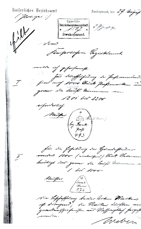 manchmal passt alles zusammen. :D eben erhielt ich nach länger Zeit mal wieder eine Hundemarke von DSWA, in excellenter Qualität. Gleichzeitig fanden wir im Archiv ein weiteres Dokument über die Hundemarken. Es sind auch die Akten über die einzelnen Hunde erhalten, also wir können nachschauen, ob Nr. 299 etwa meinen Namen trug! Gorden McGregor bildet in seinem Büchlein "DIE EINGEBORENEN PASSMARKEN VON DEUTSCH SÜDWEST AFRIKA" auf S. 14 ein Dokument vom 30. August 1904 vom Kaiserl. Bezirksamt Swakopmund, unterzeichnet vom Bezirksamtmann Dr. Fuchs, ab. Es ist die Originalbestellung von 1000 Passmarken für Eingeborene und die 1. Bestellung von ebenfalls 1000 Hundemarken für Swakopmund, Nr. 1 - 1000. Ich stelle Euch hier den eigentlichen Urheber mit seinem Schreiben vor, Polizeimeister Weber von Swakopmund.