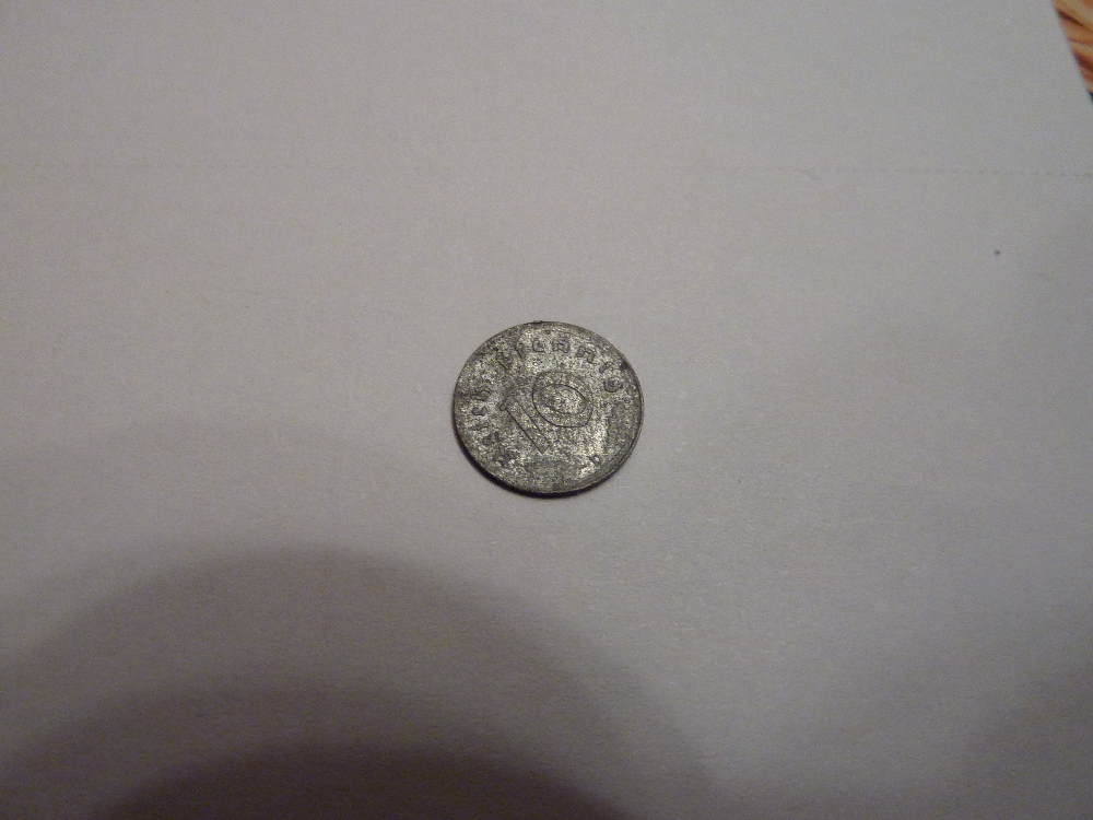 Am Avers steht Reichspfennig, die Nominale "10" und der Buchstabe "D".