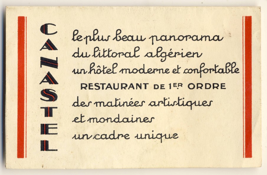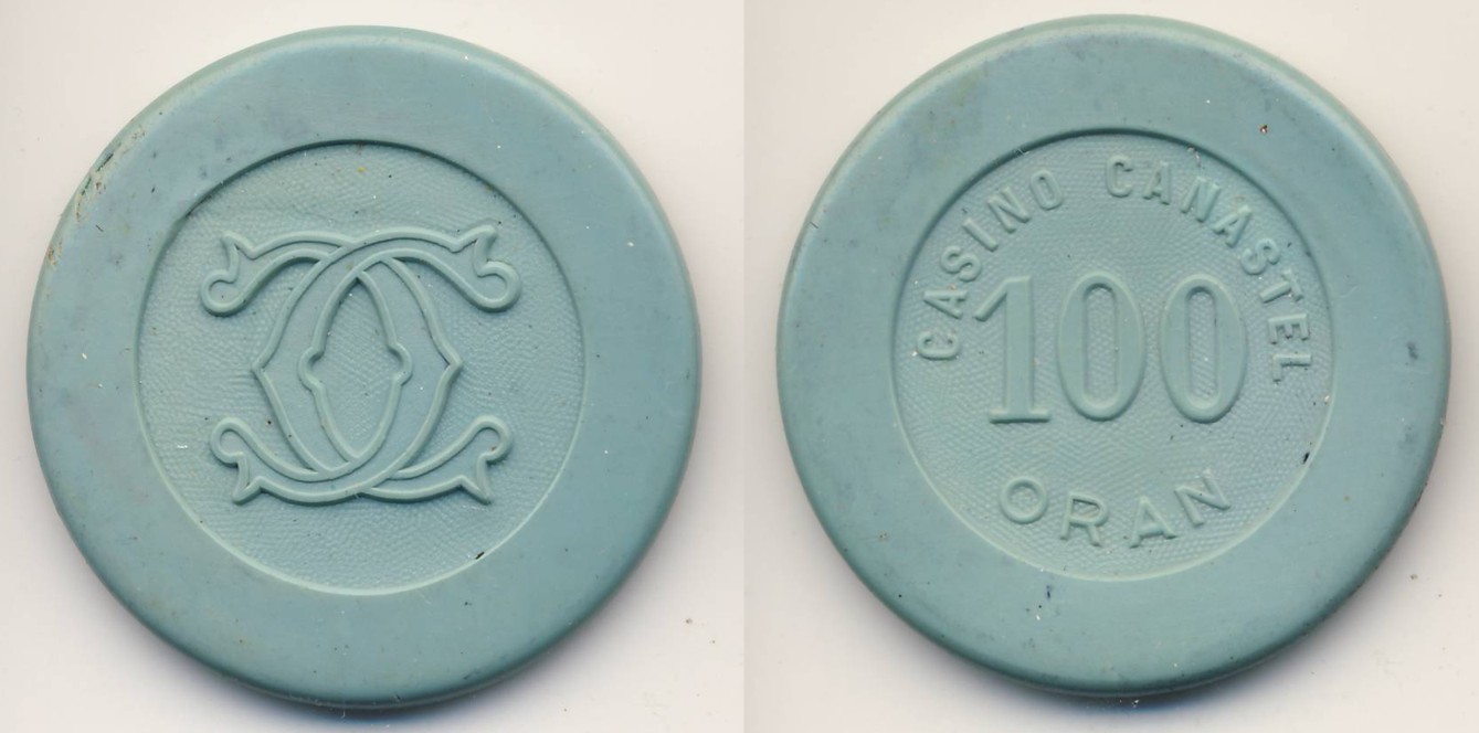 Canastel war eine Art Seebad von Oran, das dortige Casino ein beliebter Ausflugsort der Begüterten. Man machte gern auf mondän. Es gab Jetons zu 5, 20 und 100 Francs. Den 100er zeige ich hier nebst einer Menu-Karte von 1930, auf der das Auto schon recht luxuriös daherkommt.