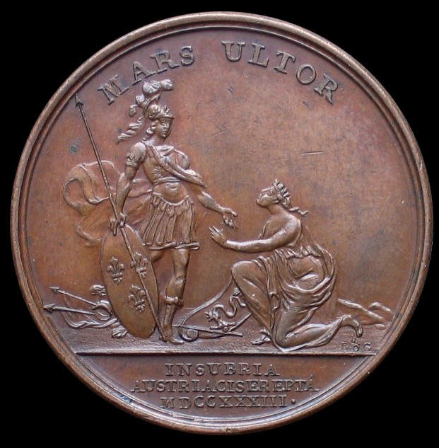 Frankreich, Louis XV. 1715-1774. Bronzemedaille 1733. Auf die Eroberungen in der Lombardei im Krieg gegen die Österreicher. Dieser Krieg in Oberitalien war ein Nebenschauplatz des Polnischen Thronfolgekrieges (1733-1738).