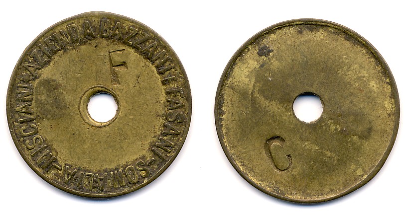 Das Stück stammt von einer "Azienda Bazzani e Fasani" im heutigen Somalia. Vermutlich noch aus italienischer Zeit. Über diese Farm/Plantage habe ich durch Googeln leider nichts herausbekommen. Irgendeine Referenz zum Token scheint es es wohl auch nicht zu geben. Die vielen Fragen, die sich mir bei diesem Stück stellen, werden durch die Stempelungen "F" auf der Vorderseite und "C" auf der Rückseite komplettiert. Das einzige, das ich herausgefunden habe ist, daß "Misciani" der Name eines Flusses in Somalia ist.
