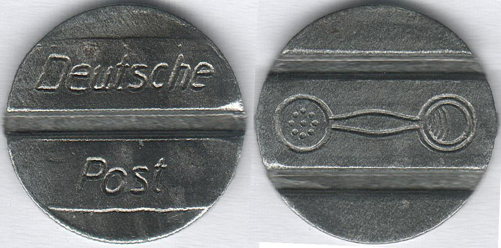Die zugehörigen Fernsprechwertmarken/Telefonmünzen haben 21 mm Außendurchmesser; die Kerben sind 2,1 mm (die beiden auf der Seite mit dem Telefonhörer) bzw 2,05 mm (zwischen dem Schriftzug "Deutsche Post") breit.