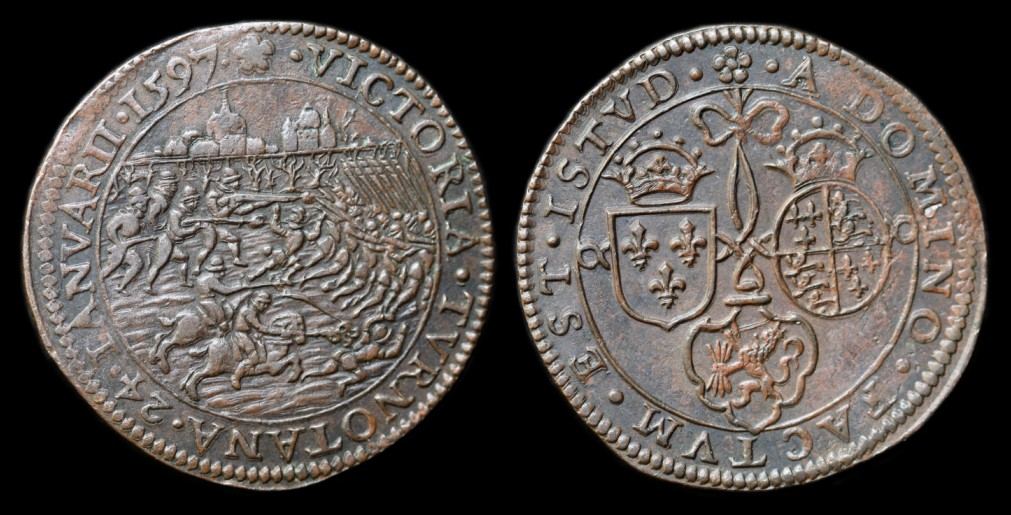 Rechenpfennig 1597. Sieg bei Turnhout unter Moritz von Oranien. Av. Angreifende Reiter und Musketiere verfolgen fliehende Spanier, im Hintergrund die Stadt Turnhout. VICTORIA TVRNOTANA 24. IANVARII. 1597. Rv. Drei Wappen durch ein Band zusammengehalten - hier haben wir das Wort „Bündnis“ im Wortsinn - für Frankreich, England und die Vereinigten Niederlande. A DOMINO FACTVM EST ISTVD. Dugn(iolle). 3412.