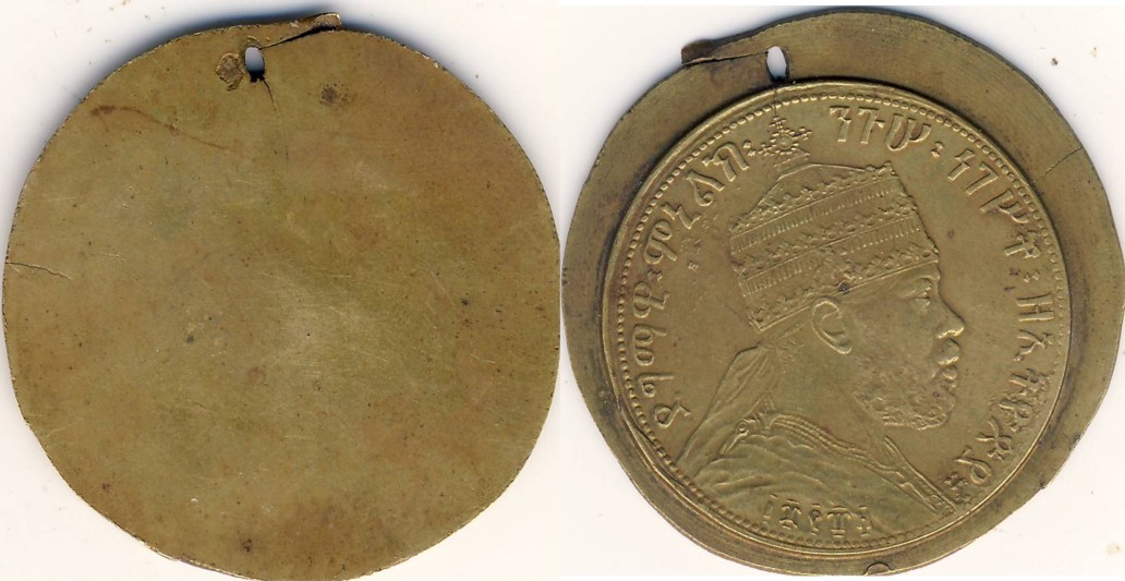 Bei dem unten abgebildeten Teil habe ich keine Ahnung, worum es sich handeln könnte. Geprägt wurde es offenbar mit einem Stempel des Stückes zu 1/2 Birr, EE 1889, Addis Abeba, KM # 15, Galerie M #15. Siehe: