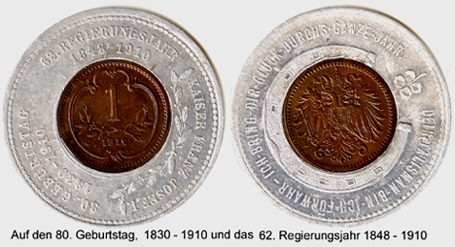 “Encased” coins are no strangers to Austrian collectors-–this I know because I’ve seen at least one “encased” copper heller of the Kaiser Franz Joseph. (But surely there are more modern examples?)