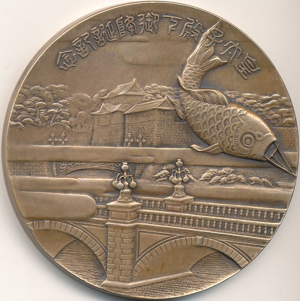Auf der anderen Seite seht ihr die Brücken von Tokio mit dem darüber gelegenen Kaiserpalast, umgeben von den Gärten (Symbolisiert durch die Bäume). Die Gärten sind hier Symbole von Fruchtbarkeit, Beständigkeit und Wachstum. Die Brücken verbinden (wie in fast jeder Kultur) das Alte mit dem Neuen und sie Symbolisieren „den Weg“ des Shintoismus. Im Shintoismus ist der Kaiser eine Hauptperson, der den Göttern gleichgestellt ist (zum Zeitpunkt der Ausgabe der Medaillie hat er den Status aber noch nicht, daher auch Symbolisch der Weg...). Nicht zuletzt zu vergessen der Fisch. In der chinesischen Mythologie steht der Karpfen für das Beamtentum bzw. für den Weg zu einem Erfolgreichem Aufstieg und hohen Ämtern. Wenn man hier Analogien zieht steht er für die Erfolgreiche Herrschaft Akihitos und es wird ihm Erfolg bei der Meisterung aller Prüfungen für sein Amt gewünscht. Allerdings kann man in dem Fisch zugleich einen sehr speziellen Fisch sehen, den Koi – dieser steht ebenfalls für Weisheit (wie der Karpfen allgemein) aber auch für hohes Alter, Reichtum und Glück. Hier werden die Götter um ihren Segen angefleht, ohne sie jedoch direkt zu benennen – gilt es doch das Gesicht zu wahren und nicht um etwas zu „betteln“ was selbstverständlich ist. Der Koi und die Goldbrasse sind die „Haustiere“ des Gottes Ebisu.
