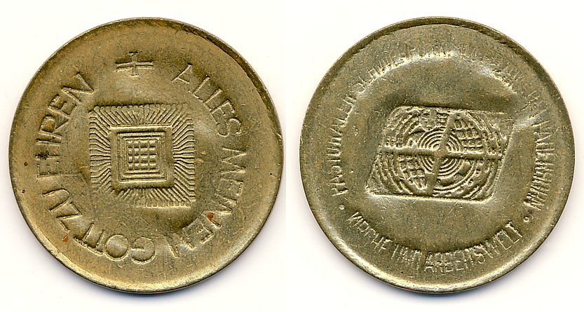Unklar ist mir nach wie vor, welchem Zweck die Ausgabe der Medaille gedient hat. War es ein Gimmick für die Teilnehmer dieser Tagung? Ist es eine Spendenmedaille, die man bekommen hat, wenn man für irgendein Projekt Geld gegeben hat? Die einfache Ausfertigung läßt mich vermuten, daß das Erzbistum Paderborn nicht dahinter steckt, sondern möglicherweise eine Privatperson oder eine kleinere Organisation, die an diesem "Schwerpunkt" beteiligt war. Ebenso rätselhaft erscheinen mir die in der Mitte auf Av und Rv gezeigten Symbole. Vielleicht kann irgend jemand weiterhelfen.