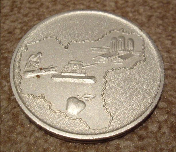 RV: Umriss des damaligen Bezirkes Halle, landwirtschaftlich-technische Objekte: Holzfäller, Mähdrescher, Apfel, Gebäude (Stallungen und Silos?)