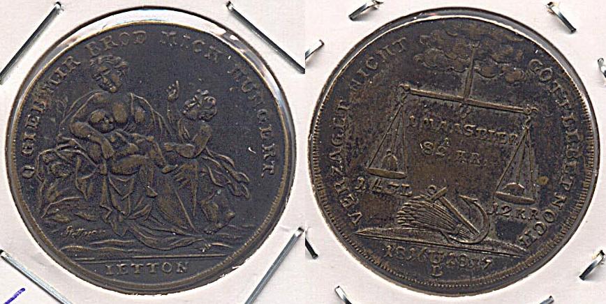 In einer Medaillenschachtel habe ich den interessanten Jeton entdeckt. Er bezieht sich offenbar auf die Hungerjahre 1816/1817 mit katastrophaler Geldentwertung.