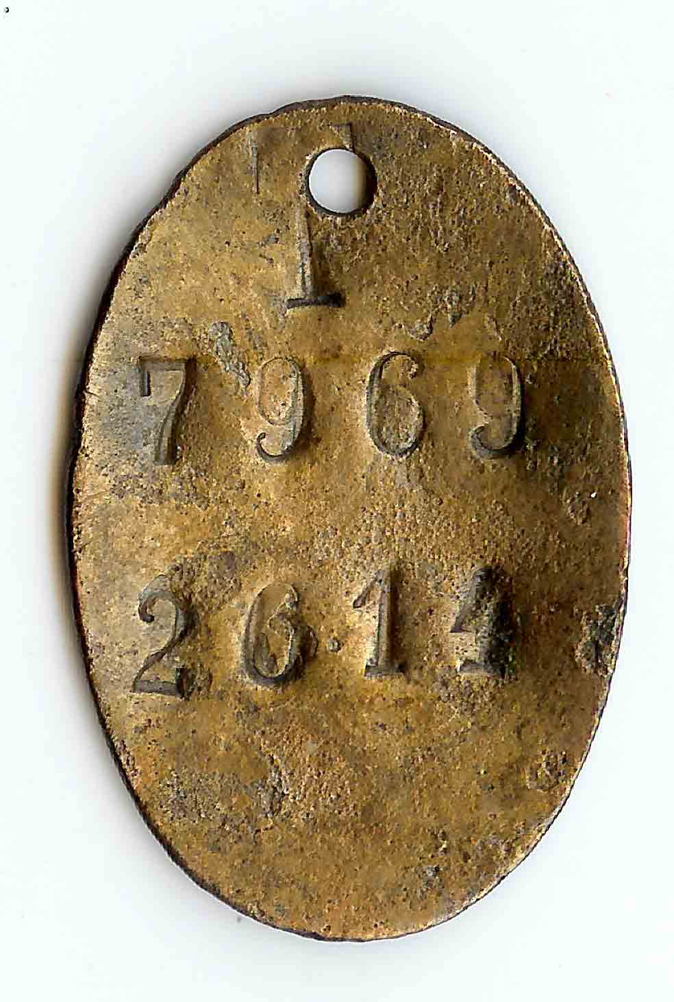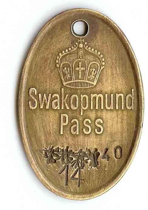 Das eingeschlagene gr. T steht für Tsumeb (hier befand sich das Werbebüro für Owamboarbeiter sowohl für die Kupferminen wie auch die Diamantenbetriebe im Südwesten). Warum die alte (deutsche) Nummer nicht ungültig gemacht wurde und rückseitig 2 Nummern eingeschlagen wurden, konnte noch nicht geklärt werden.